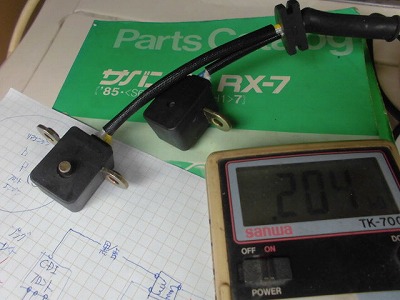 前回テスト走行でエンジンSTOP原因を軽く調査(キャブオーバーホール・コイル交換・バッテリー新品)したが不明。 そんな状態から調査スタートです。 前回、「マジ整備」するため購入すると宣言した整備書ですが、MC16用は購入してました。 MC18も持っており、以前車の整備書を購入した時に混じっておりました。 あと、KZ1000やらモトクロスやら整備書は混ざってたんだけど。 バイクはよくわからないが捨てずに保管はしております。 ![]() ![]() 発電関係は点火に関係してない事を改めて確認。 そりゃそうーだ。 ![]() ![]() 点火はこんな感じです。 CDIは流用品に交換したし、コイルも交換したし、あとはパルスジェネレータとかいうタイミングを読みだす装置を調査するだけ? この部品だけが中古のまま。 でも、これ壊れるような部品ではないんだけどなぁ。 ![]() チェックする部分をまとめて書き上げました。 ![]() まずはコイルから測定 流用新品ではない元ついていたコイルから調査。 整備書では 0.1〜0.2Ω フロント側の測定結果 3.5Ω リア側も同じような数値で問題ない? ![]() ![]() プラグケーブルまでの測定結果 4.44Ω となり、基準値内。 でも火花飛んでいるし・・・なんかなぁ。 ![]() ![]() ちなみにキャップまでの抵抗を測定すると。 整備書 5K〜13K フロント側測定結果 11.24KΩ で問題ない?になる。 1次コイルの抵抗値が微妙に高いが、それが原因になる程ではない数値なんだよねぇ。 ![]() ![]() パルスジェネレータで流用できそうな部品が届いたので早速計測。 整備書 180Ω〜220Ω 測定値は 204Ω 数値的には使えそう。 ![]() ![]() 車体についているコネクターで数値を計測しようと調べていると。あれれ?1本(緑)が多い? ※コネクターが5極 ![]() 調べると、何かエンジンかな?センサーにつながっていることが判明。 本来パルスを読み込むセンサーは2本づつで4本(4極)ですが、それ以外にエンジンの何か?のセンサー線が1本あり、流用する場合は、この線のみ残しておく必要があります。 ![]() ![]() 点火タイミングを見るところは壊れる要素がないんだよなぁ。 ![]() パルスジェネレータ リア側を測定してみると。 整備書 180Ω〜220Ω 測定値は 213Ω 数値的には問題ない。 交換は必要ないですね。 ![]() フロント側も問題なく、部品として壊れているところがない! なので怪しいのは点火タイミングだけとなるが、バイクの場合構造的に壊れる要素がない。 でも他人が整備している部分で、私は確認しておりませんので、自分でしらべなければいけません。 次回がそのあたりからはじめるとします。 エアコン直したのに屋外が涼しくなった。 なんなんだぁ。 あとは、休日(週末)の仕事時間を減らしてレストア作業時間に割り振りたいが、今は忙しくてなかなか時間が確保できない。 結局いろいろあって時間を取れないんだよなぁ。 ※今日は2時間だけ取れたので作業を実施しました。 |