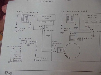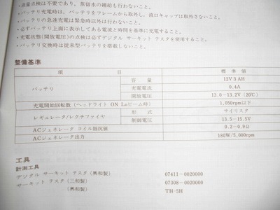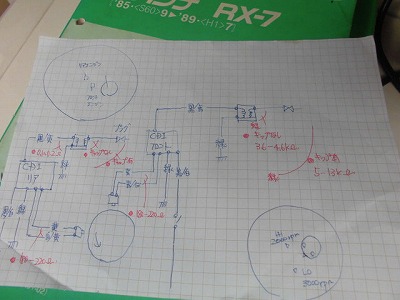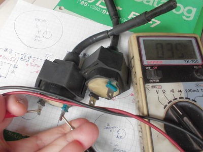 前回テスト走行でエンジンSTOP原因を軽く調査(キャブオーバーホール・コイル交換・バッテリー新品)したが不明。 そんな状態から調査スタートです。 前回、「マジ整備」するため購入すると宣言した整備書ですが、MC16用は購入してました。 MC18も持っており、以前車の整備書を購入した時に混じっておりました。 あと、KZ1000やらモトクロスやら整備書は混ざってたんだけど。 バイクはよくわからないが捨てずに保管はしております。 ![]() ![]() 発電関係は点火に関係してない事を改めて確認。 そりゃそうーだ。 ![]() ![]() 点火はこんな感じです。 CDIは流用品に交換したし、コイルも交換したし、あとはパルスジェネレータとかいうタイミングを読みだす装置を調査するだけ? この部品だけが中古のまま。 でも、これ壊れるような部品ではないんだけどなぁ。 ![]() チェックする部分をまとめて書き上げました。 ![]() まずはコイルから測定 流用新品ではない元ついていたコイルから調査。 整備書では 0.1〜0.2Ω フロント側の測定結果 3.5Ω リア側も同じような数値で問題ない? ![]() ![]() プラグケーブルまでの測定結果 4.44Ω となり、基準値内。 でも火花飛んでいるし・・・なんかなぁ。 ![]() ![]() ちなみにキャップまでの抵抗を測定すると。 整備書 5K〜13K フロント側測定結果 11.24KΩ で問題ない?になる。 1次コイルの抵抗値が微妙に高いが、それが原因になる程ではない数値なんだよねぇ。 ![]() ![]() パルスジェネレータで流用できそうな部品が届いたので早速計測。 整備書 180Ω〜220Ω 測定値は 204Ω 数値的には使えそう。 ![]() ![]() 車体についているコネクターで数値を計測しようと調べていると。あれれ?1本(緑)が多い? ※コネクターが5極 ![]() 調べると、何かエンジンかな?センサーにつながっていることが判明。 本来パルスを読み込むセンサーは2本づつで4本(4極)ですが、それ以外にエンジンの何か?のセンサー線が1本あり、流用する場合は、この線のみ残しておく必要があります。 ![]() ![]() 点火タイミングを見るところは壊れる要素がないんだよなぁ。 ![]() パルスジェネレータ リア側を測定してみると。 整備書 180Ω〜220Ω 測定値は 213Ω 数値的には問題ない。 交換は必要ないですね。 ![]() フロント側も問題なく、部品として壊れているところがない! なので怪しいのは点火タイミングだけとなるが、バイクの場合構造的に壊れる要素がない。 でも他人が整備している部分で、私は確認しておりませんので、自分でしらべなければいけません。 次回がそのあたりからはじめるとします。 エアコン直したのに屋外が涼しくなった。 なんなんだぁ。 あとは、休日(週末)の仕事時間を減らしてレストア作業時間に割り振りたいが、今は忙しくてなかなか時間が確保できない。 結局いろいろあって時間を取れないんだよなぁ。 ※今日は2時間だけ取れたので作業を実施しました。 |