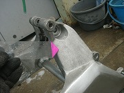 いつも面白いバイクがあるのがこの工場です。先代社長は、千葉で古くからオートバイの整備をしていたので、珍しいバイクも少なくない。現在の社長もバイク好き。だからお客さんのバイクも渋い!ゼファーでモリワキ!ね。カコヨイでしょ。 ![]() 1.さあボディの清掃です。アルミだから・・・と思っていたら、油まみれ!そして最後の写真には多くの小石が!ブレーキクリーナーできれいにしていたが、何本使ってもきれいにならない。そうだ!今日は雨が降っているから・・・ ![]() 2.キッチンクリーナーを使おう!アルミOKだから安心。そしてたわしでゴシゴシ!ショックが邪魔なので取り外すことに! ![]() 3.結局ほとんどバラスことになるのはいつものこと! ![]() 4.となるとチェーンガードも気になり取り外すことに。 ![]() 5.とくに汚れがひどいチェーン周りの頑固な汚れに!キッチンクリーナー。実はオレンジ配合がお勧めです。 ![]() 6.でこの部品名前は・・・・知りませんが。この部品も汚れが気になるので取り外すことに。3番目の切り込みにあわせてあることを確認して取り外します。 ![]() 7.クリーナーがなくなったのでここで終了。 ![]() 8.まずは、ボツボツがあった矢印の部分を400番のペーパーでがんがん磨きます。 ![]() 9.ただし、ココは鋳造のごつごつがあるので、ここはヤスリ駄目です。そして、2枚目の写真は、青棒で磨くところなのでココも駄目。 ![]() 10.ショックも汚いので、真鍮のブラシとブレーキクリーナーでひたすら磨きます。 ![]() 11.最後にシリコーンスプレーでアルミをふき取ります。 ![]() 12.さあ組み付け!と思ったがまだ汚いところを見つけたので真鍮ブラシでガッツリ磨きます。これで思い残すことはありません。組み立てに入ります。 ![]() 13.程度が良いのでベアリングは交換しませんが、グリスアップ! ![]() 14.そしてトルクレンチを用意してショックアブソーバーの下側を組み付けます。ココは6kgです。このタイプのトルクレンチは、カッチとショックが伝われば終了。 ![]() 15.そしてメインのボルトを取り付ける前に、取り外す際に落ちてきた部品。この部品も磨いて、グリスアップ! 16.これを、この場所に取り付けて、メインの太いボルトを指します。 17.このボルトは、六角レンチで1kgで締めて、ナット側を6kg。そして、専用工具5250円を使って6kgで締め付けます。 ![]() 18.次にショックアブソーバー上側も取り付けます。締め付けは6kgです。 19.このホースの通る場所がわからなくなり、以前のWEBページを確認すると上側を通ることが判明。 ![]() 20.下側も取り付けようとしたら、汚れが気になったので取り外して、磨いてグリスアップ! ![]() 21.このボルトを取り付け。締め付けは6kg。 ![]() 今日の完成品です。 |