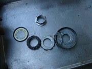 1.さあ、フロントの組み付けです。 ![]() 2.まずは鍵穴をカットです。これが以外に時間がかかりました。最後ヤスリがけをしました。 ![]() 3.そして、右側のみ転んだ後が。反対側はきれいなのですが・・ ![]() 4.ここで、GM-8300登場。エポキシパテなのですが、これが硬い。マフラーでも実験したが、マフラーの振動ではさすがに補強が必要だったが、ココはどうかな?固まるまで何も出来ないのでここは終了。 ![]() 5.下側は、ボルトを外して、ワイヤーブラシでサビ取り実施しました。 ![]() 6.フロントフォークの穴の中がサビが発生していたので、800番のヤスリで磨きました。その後テープを張って塗装の下準備完了です。 ![]() 7.ベアリングはひたすらウェスで磨いて、ブレーキクリナーできれいにします。そしてベアリング用のグリスをしっかり塗ります。 ![]() 8.ここはサッシュコート(アクリル塗装)で塗装して、ベアリングをセッティング。 ![]() 9.さて、カウルですが、先日スーパーオートバックスの隣にあるオートバイの専門店で、カウルを止める金具を購入したが、「大」だったのですが。全く大きさが違う!「中」?「小」?また買いに行く必要があります。 ![]() 10.ついでにゴム部品に使う「シリコーングリース」を購入。以外に高い!2850円! ![]() 11.ちょっと外れてしまったので、軌道修正。上側の部品をすべてブレーキクリーナーとウェスでひたすらきれいにしました。そしてグリスを塗りこみます。 ![]() 12.まずは、ベアリングを入れて、ゴムがある部品。そして一番大きな部品を取り付けます。 ![]() 13.専用工具で締め付けます。ここはトルクレンチが使えないので、約3kgをテルクレンチで締め付けます。そしてロック用のワッシャーを入れます。 ![]() 14.最後にこの部品を取り付けますが、先につけた部品と一緒に回る前で締め付け終了です。 ![]() 15.ワッシャーを上に折り込んで終了。 ![]() さあ、これでやっと台座を取り付けることができました。エンジンをやっと搭載することができます。というより時間がかかったなぁ。 ![]() |