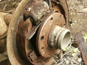 1.部品取りからLSDが入っていることを願って取りはずしのお勉強。実際に行うと色々見えてきて楽しかったです。錆びの固まりのため外せたもんじゃありませんでした。タイヤを外すと、穴が残ります。この穴にマイナスドライバーを突っ込んでハンマーでたたきました。